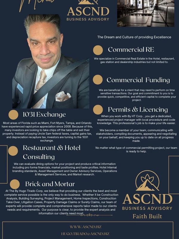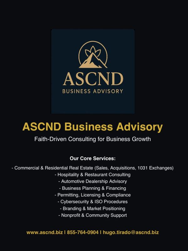 At Ascnd Business Advisory, we are guided by faith and integrity to serve as trusted stewards for our client's visions. Our mission is to provide exceptional consulting and advisory services across Commercial Real Estate, Hospitality, Restaurants, Automotive dealerships, Business Financing, Cyber Security, ISO Procedures, Business Planning and Development to name some with a focus on Excellence, Transparency, and Ethical Leadership.